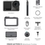 O Combo de Aventura inclui a câmera Osmo Action 3, três baterias de alta capacidade, um suporte magnético de três garras, um quadro protetor, dois protetores de lente de borracha, dois adaptadores de liberação rápida, uma base adesiva plana, dois parafusos de travamento, um cabo de carregamento USB Type-C, uma caixa multifuncional para baterias e um bastão de extensão para selfies.
